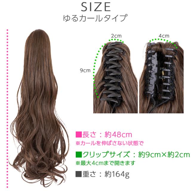 | 髪の長さ | [ゆるカールタイプ]約48cm クリップサイズ:縦約9cm×横約2cm [ストレートタイプ]約60cm クリップサイズ:縦約9cm×横約2cm |