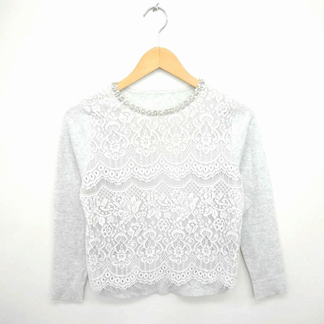 【中古】ジャスグリッティー JUSGLITTY ニット セーター 丸首 レース ビジュー 薄手 長袖 2 グレー 灰 /TT3