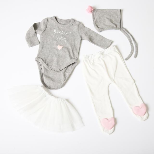 ベビー用ギフトボックス 4点セット 出産お祝 ロンパース チュチュ つま先にハート付パンツ ポンポン付き帽子 1ヵ月〜6ヵ月用 6ヵ月〜12ヵ月用 韓国子供服 お洒落 お洒落ベビー カッコイイ カワイイ【宅配便送料無料】【選べるギフトラッピング無料】