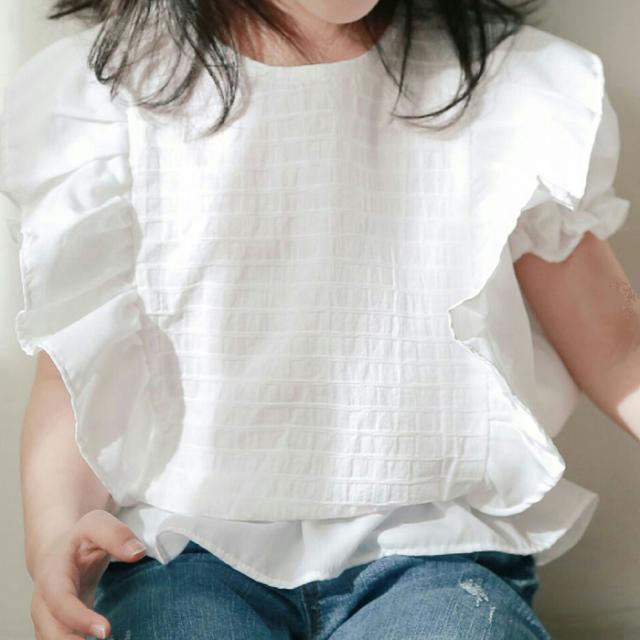 フロントはピンタック。両サイドが大きめのフリルのブラウス。袖はパフスリーブなので、動きやすいです。ウエスト部分が、ゴムでブラウジングになるデザインなので、裾がフリルになるので、パンツでもスカートでもあわせやすいです。