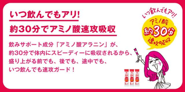 ◆いつ飲んでもアリ!◆ ◆約30分でアミノ酸速攻吸収◆ 飲みサポート成分「アミノ酸アラニン」が、約30分で体内にスピーディーに吸収 されるから、盛り上がる前でも、後でも、 途中でも、いつ飲んでも速攻ガード! 水なしでもオイシク飲める顆粒タイプ※ だから、お菓子感覚でチャージできます。 ※顆粒が苦手な方は、他のお飲み物と一緒にお召し上がりください。 ※スティック(3g)を1日1〜3本を目安に お飲みください。