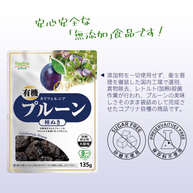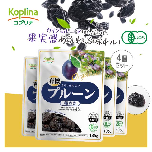 \55%OFF 賞味期限間近2026.2.25/ プルーン ドライプルーン 種なし オーガニック 有機プルーン 種抜き 135g×4袋 カリフォルニア産 有機JAS 無添加 砂糖不使用 鉄分 ミネラル 大粒 非常食 保存食 食品 ドライフルーツ 送料無料 コプリナ