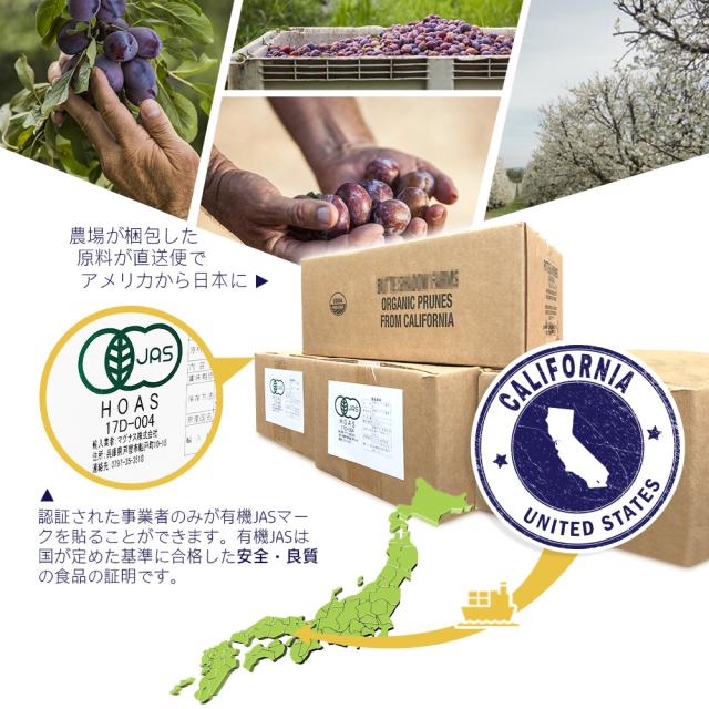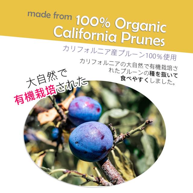 ●【有機プルーン100%使用】カリフォルニアで有機栽培されたプルーンの種をぬき、しっとりやわらかな食感に仕上げました。当社が独自にアメリカの農場より輸入したプルーンを使用