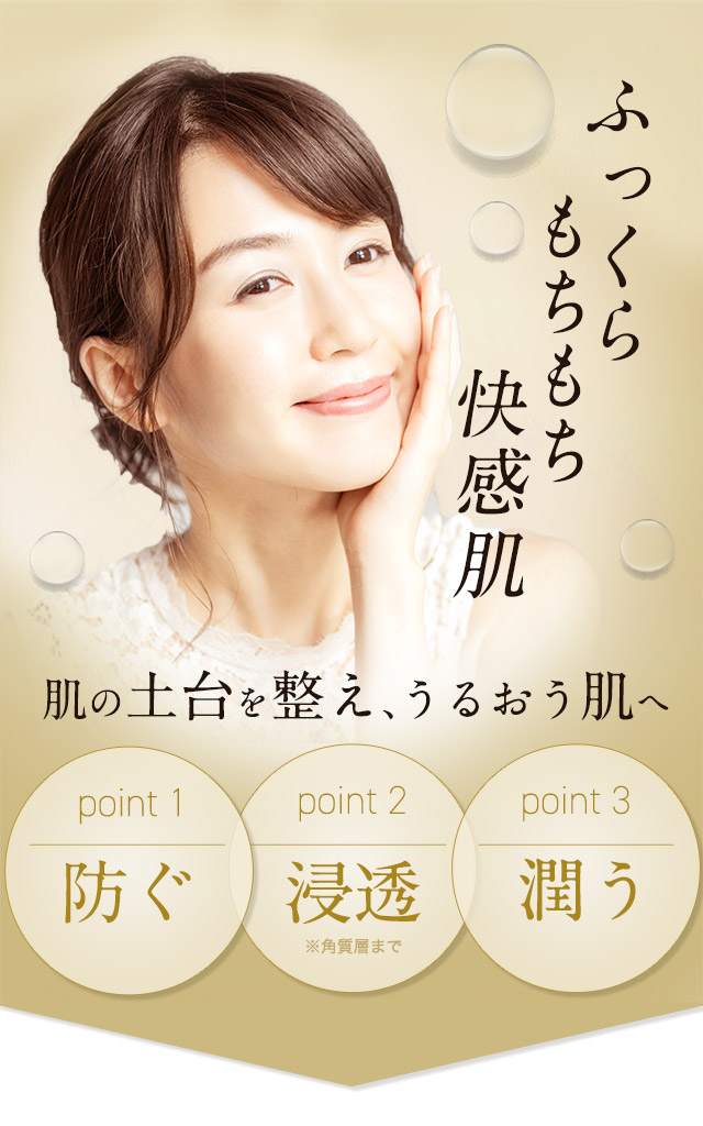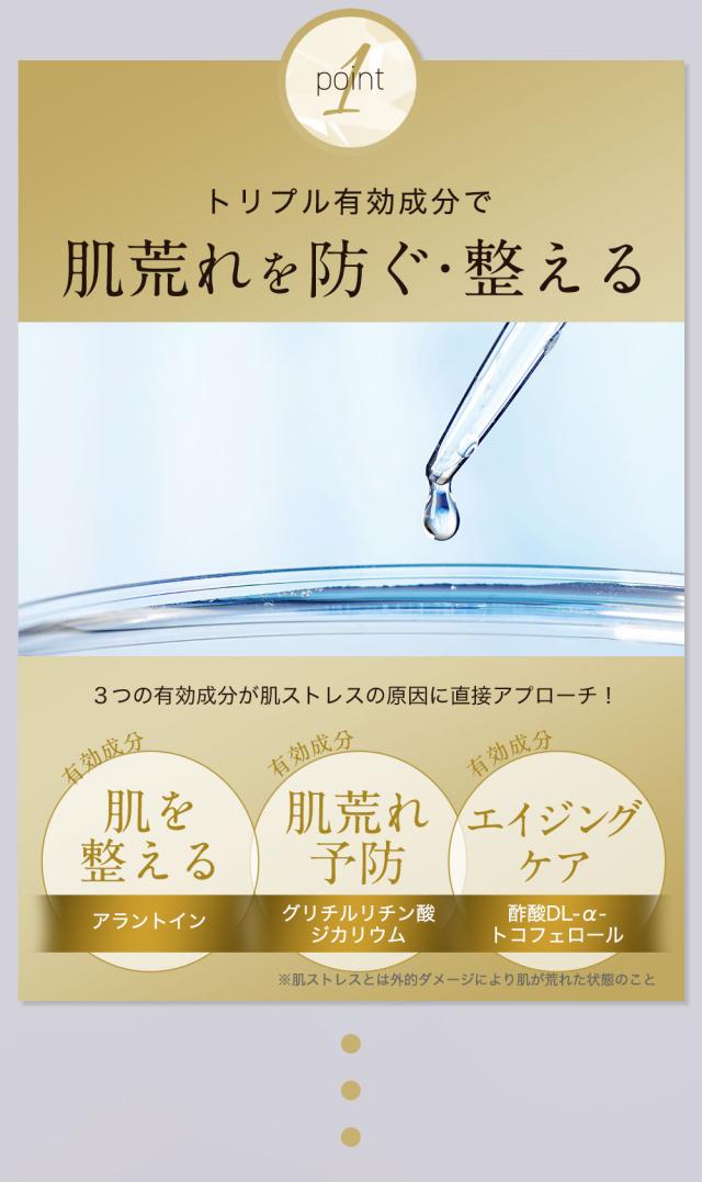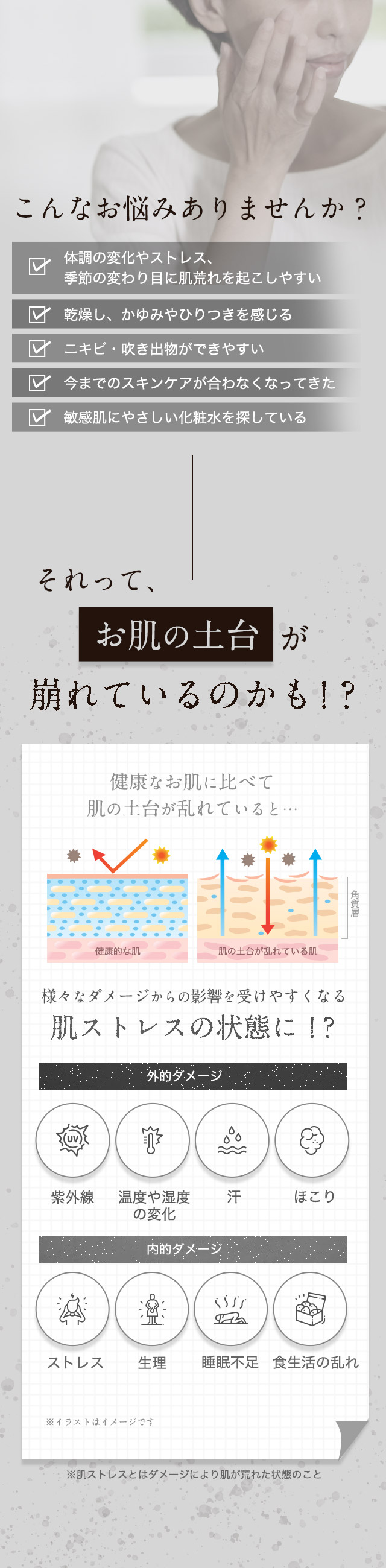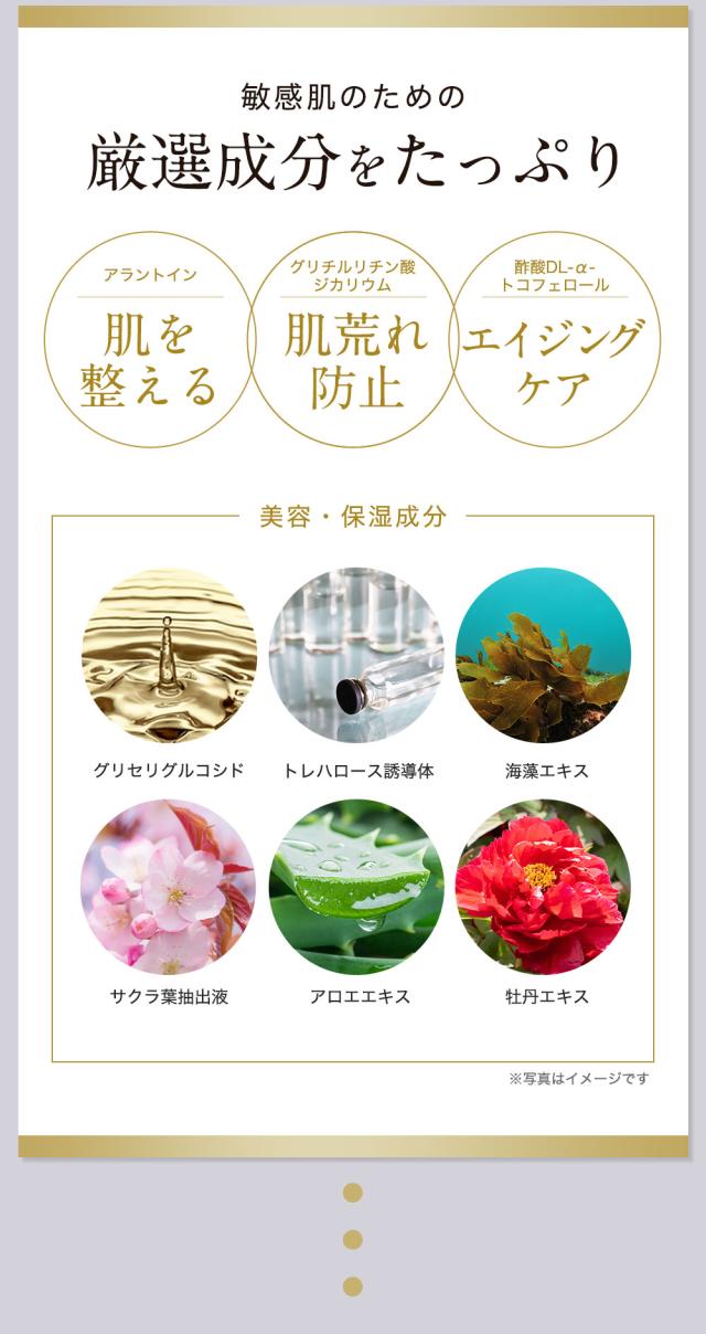 角質層まで浸透保湿する敏感肌さん用スキンケア。有効成分のグリチルリチン酸2K、アラントイン、酢酸トコフェロールが、肌荒れを防ぎ、肌土台を整えます。