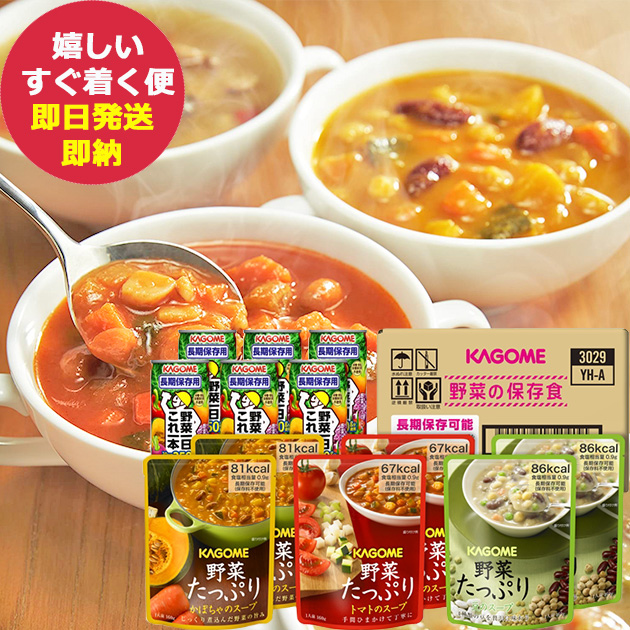 ●野菜一日これ一本長期保存用190g×6本、トマトのスープ・豆のスープ・かぼちゃのスープ各160g×各2袋