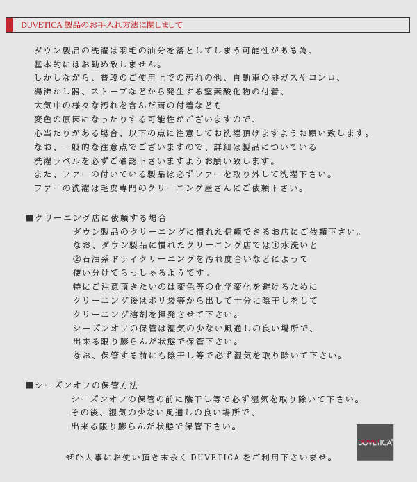 Francis Beanで取り扱うDUVETICA商品には正規販売店の証明として 「DUVETICA F.E.N Official Card」が付属します。 「DUVETICA F.E.N Official Card」のデザインは発売時期により変更になっている場合があります。 | ||||||