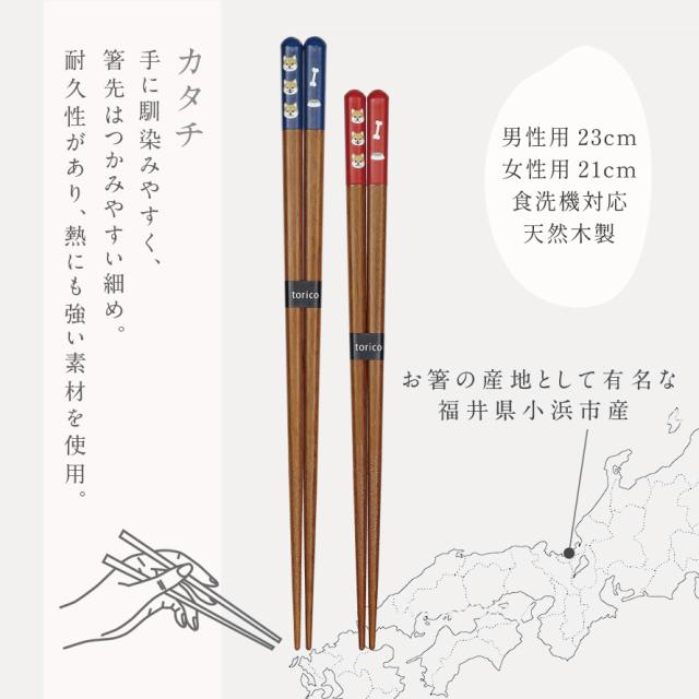 お箸の産地として有名で、国内の塗箸生産量の七割をしめる福井県小浜市で作られたお箸。職人の手によって一本一本塗りこまれた箸に、優しい表情の柴犬がかわいいデザインです。
