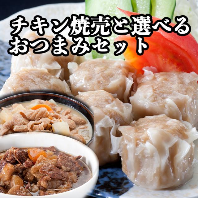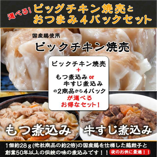 【送料無料】【焼売】国産ビッグチキン焼売(1パック500g)と選べるおつまみ4パックセット 牛すじ煮込み、もつ煮込み【鳥益】温めるだけの簡単調理 お取り寄せグルメ