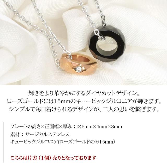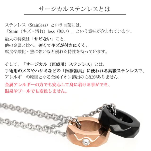 輝きをより華やかにするダイヤカットデザイン。シンプルで毎日つけられるデザインです。 ローズゴールドのみ、1.5mmのキュービックジルコニアが輝きます。 コーディネートに合わせやすく、ペアアイテムとしてもオススメです。 着けっぱなしにしていたり汗をかいても痒くならない、サージカルステンレス製だから 金属アレルギーの方にも安心してご使用いただけます。 温泉や海で変色する心配もないので、どこへ行く時もいつも着けていられます。 ネックレスチェーンはデザインにあわせカット小豆チェーンを使用しております。
