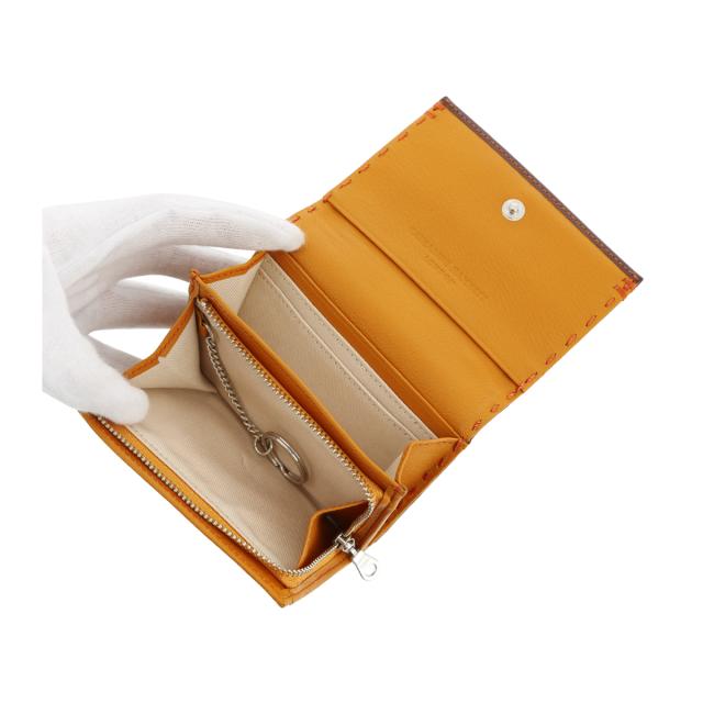 手縫い仕上げと遊び心のあるカラーコンビをそのままに使用する材料をアップグレードしました。表革は、国産の牛ヌメ革をアンティーク調に染め上げ、さらに複雑な型押しや揉み加工を施す事により無二の質感になっています。内装生地にはリサイクルポリエステル繊維ECOPETを使用、環境問題に取り組むキャサリンハムネットの意識を体現しております。