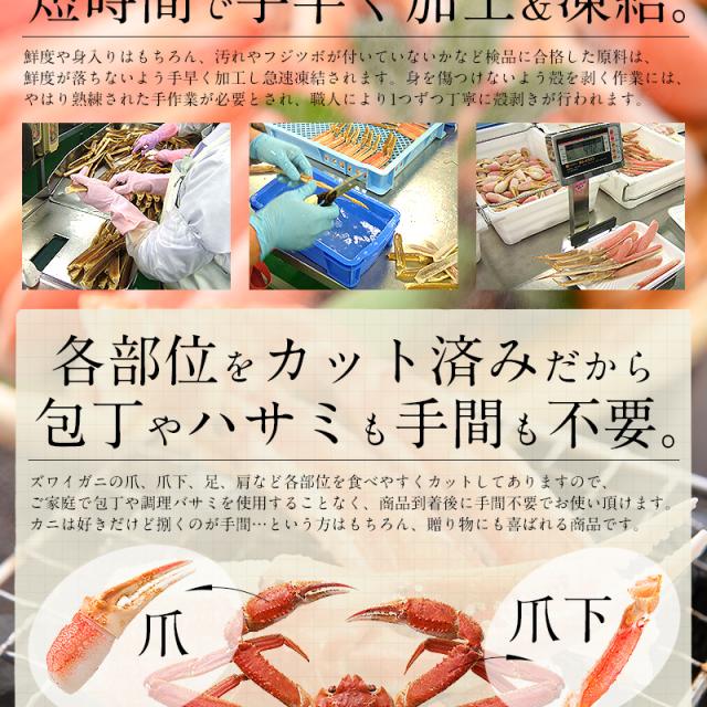 ズワイガニ ポーション ずわいがに しゃぶしゃぶ 刺身 ズワイガニ むき身 ズワイガニポーション かに カニ 蟹 刺身OKの高鮮度!食べやすくカット済みでお刺身やカニ鍋、しゃぶしゃぶ、焼き蟹などいろいろな調理方法でお召し上がり頂けます。