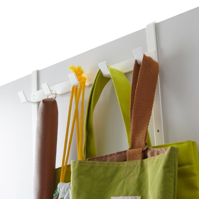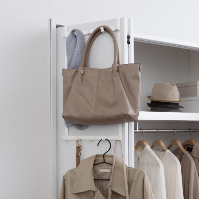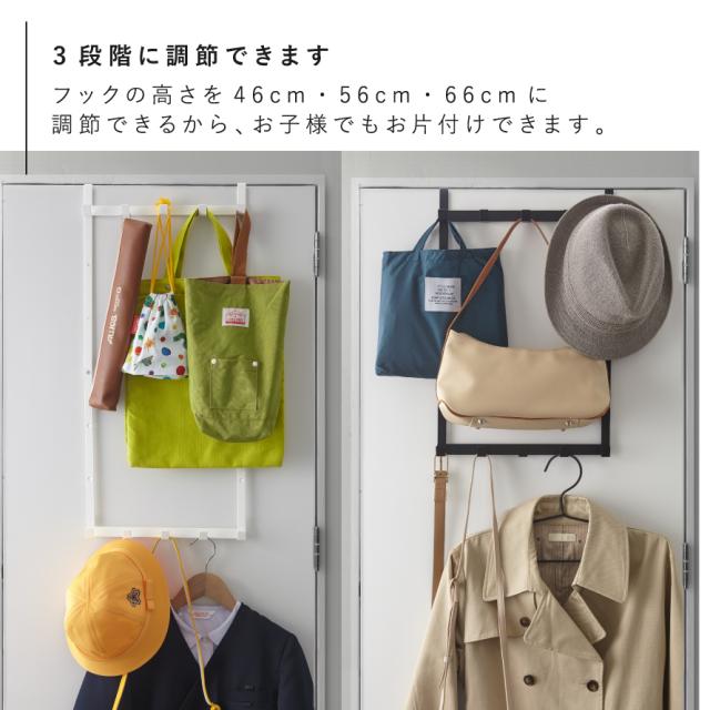 ドアや折れ戸に簡単取り付けの便利なドアハンガー。身長や掛けるものに合わせて46、56、66cmの3段階高さ調節が可能です。