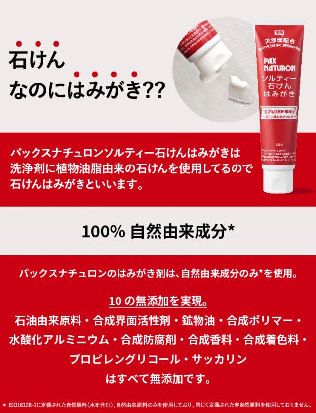 ●100%自然由来成分※!パックスナチュロンのはみがき剤は、自然由来成分のみ※を使用。10の無添加を実現。石油由来原料・合成界面活性剤・鉱物油・合成ポリマー・水酸化アルミニウム・合成防腐剤・合成香料・合成着色料・プロピレングリコール・サッカリンはすべて無添加です。