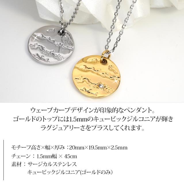 ウェーブカーブデザインが印象的なペンダント。 ゴールドには1.5mmのキュービックジルコニアが輝き、ラグジュアリーさをプラスしてくれます。 着けっぱなしにしていたり汗をかいても痒くならない、サージカルステンレス製だから 金属アレルギーの方にも安心してご使用いただけます。 温泉や海で変色する心配もないので、どこへ行く時もいつも着けていられます。 ネックレスチェーンはデザインにあわせカット小豆チェーンを使用しております。