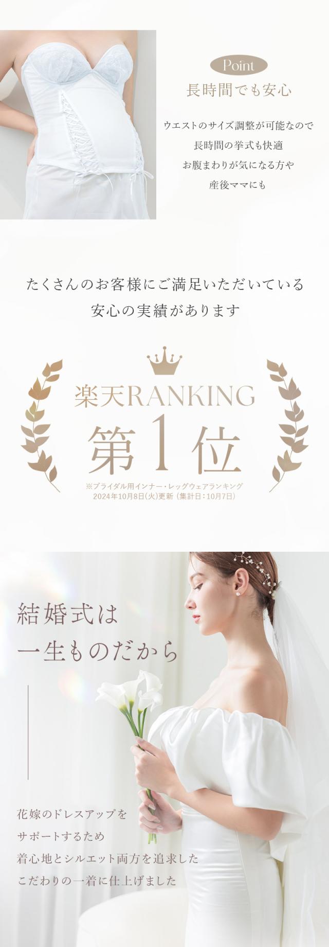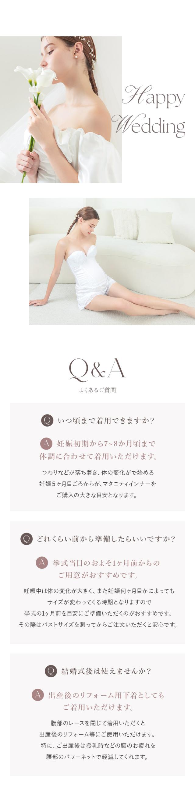 【リニューアル版】 ビスチェ+ペチパンツ+パッド+調節ホック / 計4点セット 〜ブライダルインナーシリーズ〜 妊娠初期から7〜8か月まで体調に合わせて着られる、マタニティー仕様のブライダルインナー。 高級感のあるレースデザインで花嫁の美しさをより引き立てる。 背中あきのドレスも美しく着こなせます。 4本のサイドボーンでボディをしっかりと支え、伸びの良いサイドネットが程よいフィット感を実現。 Wワイヤーが美しいバストラインを作り出し、引っ掛かりのないスムース生地を使用することで、着心地と肌触りにも細部までこだわりました。 「ママを気遣う」特別設計 ■お腹に負担をかけない調整可能ビスチェ ボディー部分にレースアップを施し、絞りの強さを変えることでお腹の大きさに合わせたフィット感に調整できます。 付属の予備ホックを使えば、サイズの拡大も可能です。 食い込みを防ぐため、サイドボーンや裾回りは柔らかく仕上げました。 ■「お腹すっぽり」ペチパンツ デリケートなお腹部分は、ゆったり目に設計したウエストゴムを使用。 裾はフレアタイプで、ゆったりストレスフリーな履き心地。 |