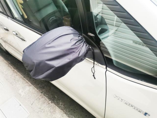 取付簡単、ミラーに被って、ひもを締めて、取り付け完了です