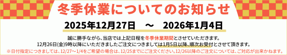 12/27(土)〜1/4(日)は、冬季休業期間の為、12/26(金)9時以降のご注文につきましては、1/5(月)以降に順次お受付とさせていただきます。