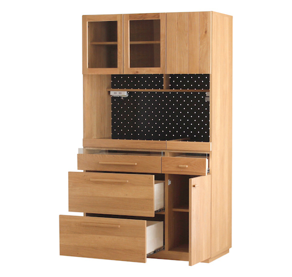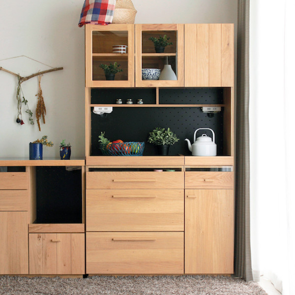 木目の美しさが映えるシンプルなモダンナチュラルデザインに仕上げたキッチンボードです。節のある木目を生かした前板と引出しのガラスがアクセントになり、お部屋を温もり溢れる空間に演出します。