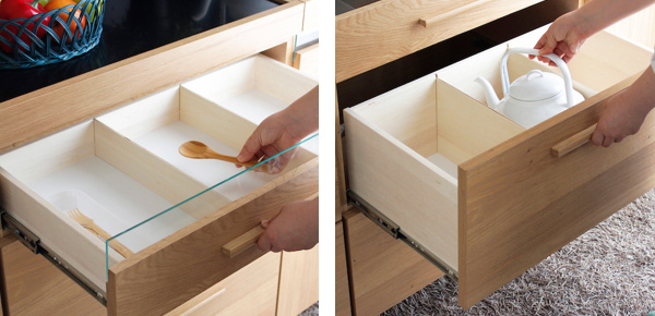 引出し上段にはたくさんのカトラリーやランチョンマット、その他小物がたくさん入るスペースが確保され、中・下段には高さのある食器やビンなどを収納できます。奥に入れた物まで出し入れしやすい、フルスライドレール仕様です。上部、下部にある開き戸内もスペースがたっぷりあるので、キッチンで使用する様々な物を一か所にまとめて収納でき、便利にお使いいただけます。