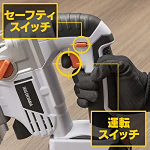 セーフティスイッチと運転スイッチを同時に押すことで起動する「ダブルロック」仕様だから不意の誤作動を防止する。握る強さでスピード変速