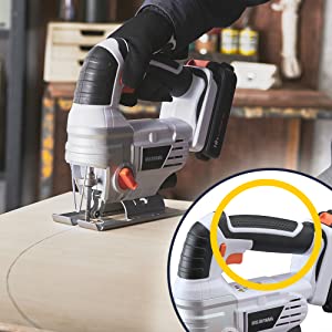 運転スイッチは握る強さで0〜2400min-1のストローク数に変速。曲線などの細部切断でスピードをコントロールしやすい。