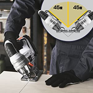 ガイドプレートを動かすことで、左右最大45度まで傾斜切断できる。角度を固定できるので、一定の傾斜で切断。正確な斜め切りができる。