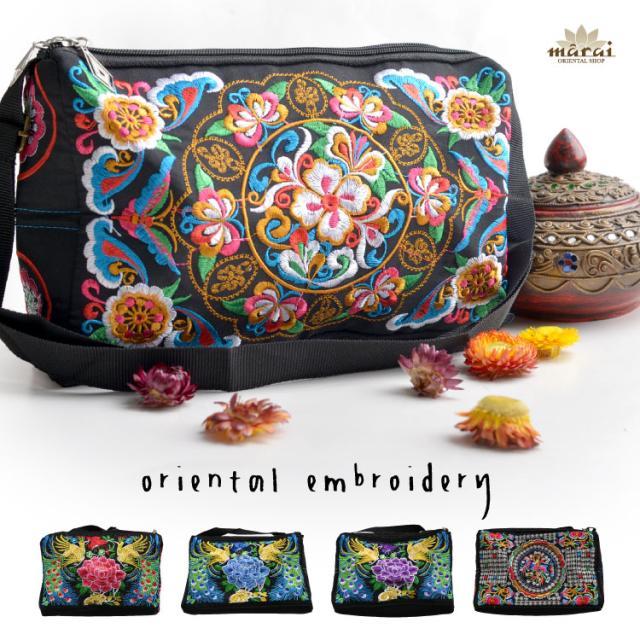 アジアンムードいっぱいの刺繍を施した程よいサイズのショルダーバッグ。