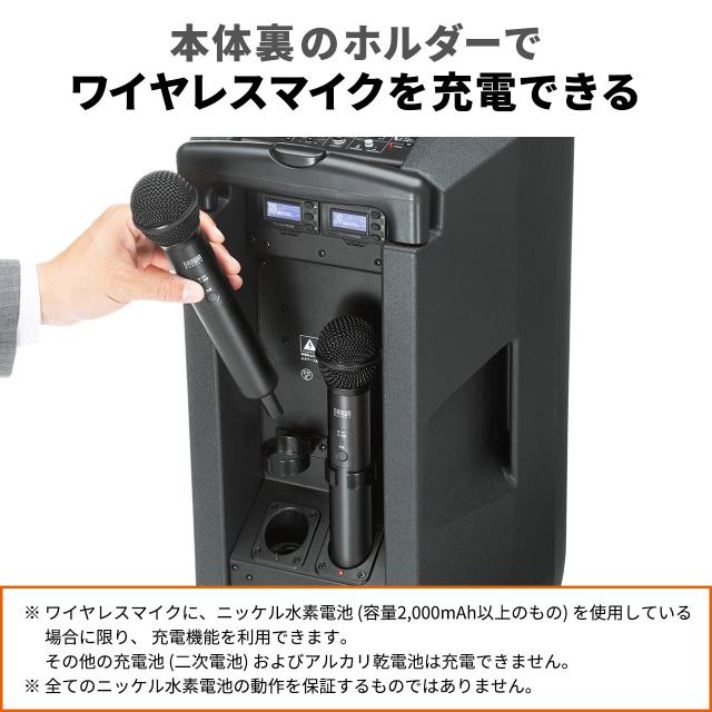 ●ワイヤレスマイクをスピーカー背面のマイクホルダーにセットすると充電できます。※ニッケル水素電池(別売)が必要です。