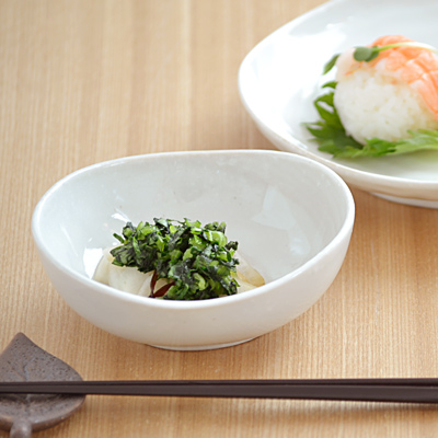 毎日活躍する小鉢。まん丸ではなく楕円のような歪んだ形と渦模様が味わい深い食器です。普段の食卓に添える和え物や漬物などのちょっとした一品にどうぞ。
