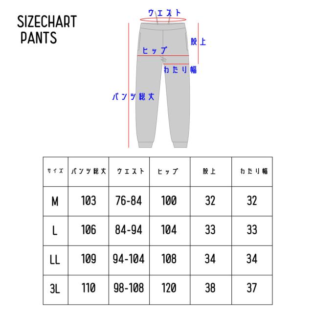 パンツ総丈(約)110cm ウエスト(約)98-108cm ヒップ(約)120cm 股上(約)38cm わたり幅(約)37cm