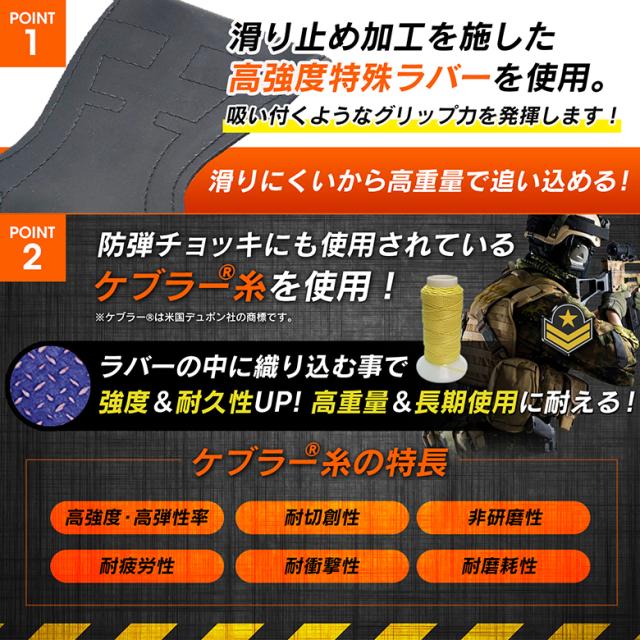 ●滑り止め加工を施した高強度特殊ラバーを使用。ラバーの厚みは4mmで手の平をしっかり保護。米国デュポン社製のケブラー(R)糸を織り込むことにより、高強度・高耐久性・耐疲労性・耐摩耗性のラバーに。高重量の使用に耐え、長く使えるラバーです。バーベルをしっかりつかむにはレザーより断然ラバー!【グリップ感】が違います。初心者から中級者の方まで。