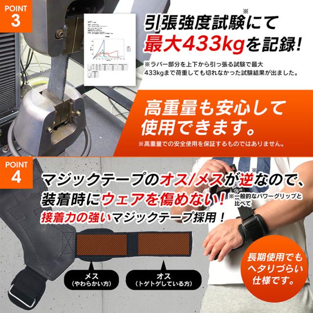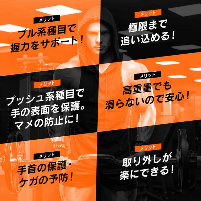 ●プル系種目(デッドリフト、 ワンハンドローイング、ベントオーバーローイング、ラットプルダウン、シュラッグなど)で握力をサポートすることで、極限まで追い込めます。 プッシュ系種目(ベンチプレス、ショルダープレスなど)では手の平にマメができたり、手の平を痛めるのを防ぐことにより、効率のいいトレーニングが可能に。