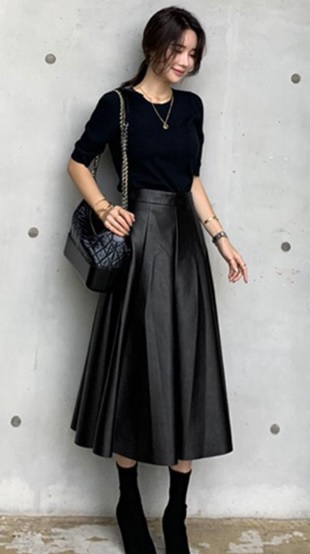 フレアスカート ハイウェストスカート PU レザー ミモレ丈 無地 ブラウン 黒 秋冬 仕事 可愛い シンプル 人気 Aライン 10代 20代 30代 お出かけ デート 上品 きれいめ 清楚 大人女子 OL オフィス トレンド