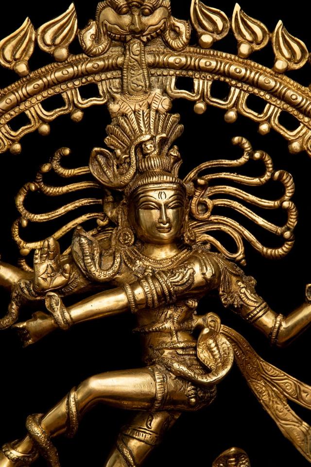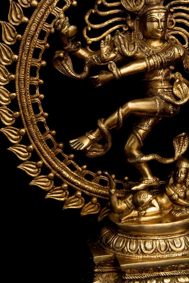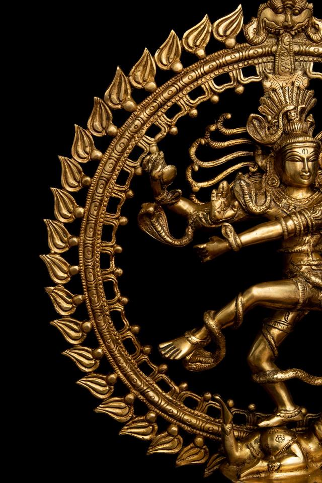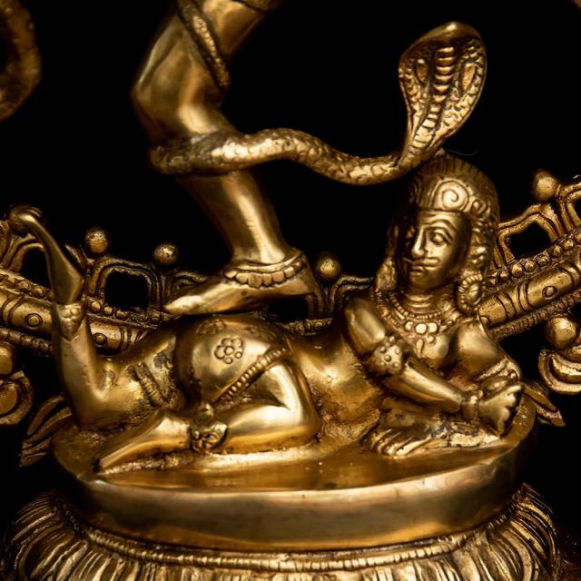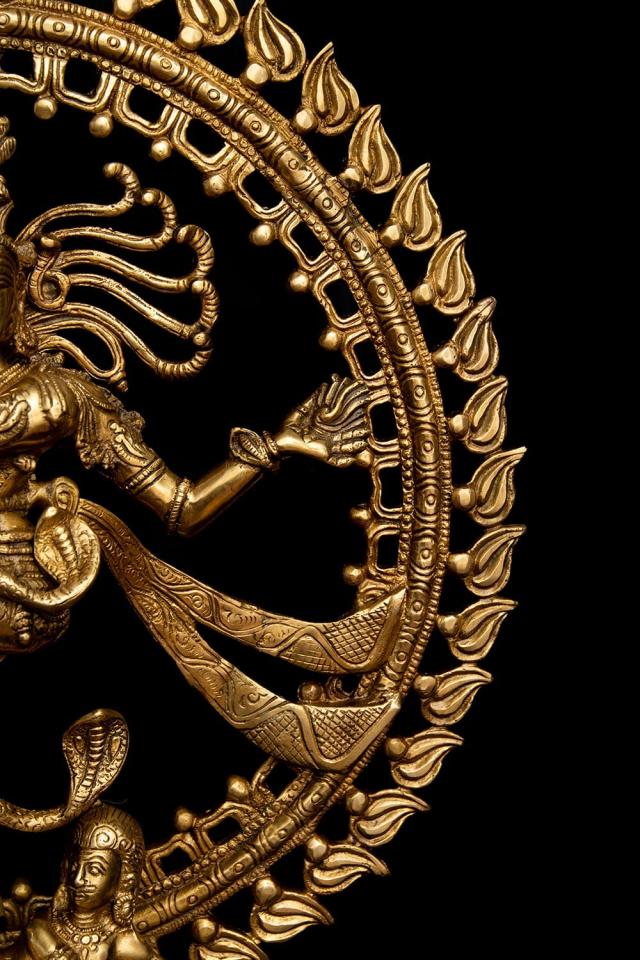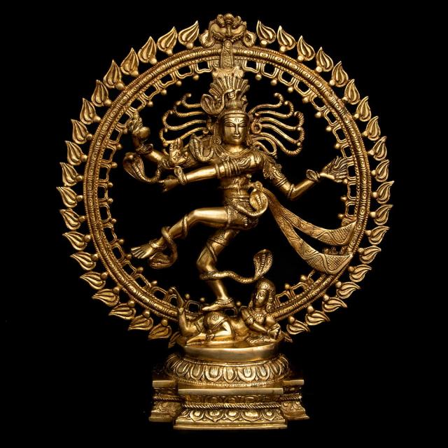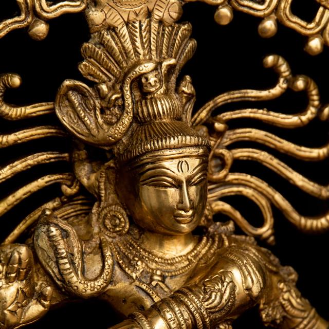 青い肌に虎の皮衣一枚だけを身につけ、もつれた長髪を結い上げている、質素な行者の姿で表されることの多いシヴァ神。ヒマーラヤの山中で何千年もの瞑想に励んだり、天界からガンガー(ガンジス河)が降ろされたときには衝撃で地が割れてしまわないようにその髪の中に受け止めたりと、慈悲深く寛大な心を語る神話は数多く残されています。額には開眼した時すべてを焼き尽くすと言われる「第三の目」が、そして聖なる灰で描かれた横三本線が表されています。猛毒のコブラすらも屈服させて首飾りにしてしまい、最強の武器である三叉の矛を持つ至高神としても人気を誇ります。■ダンシング・シヴァの律動