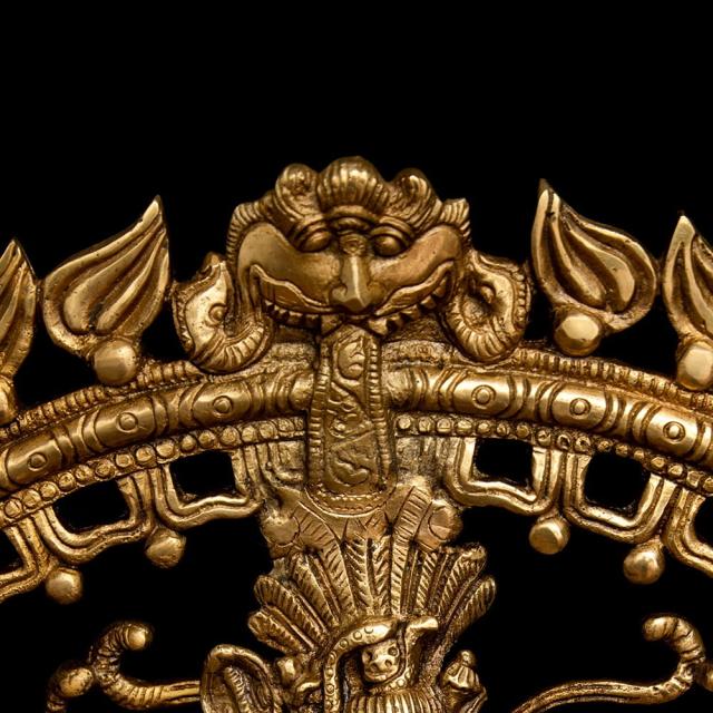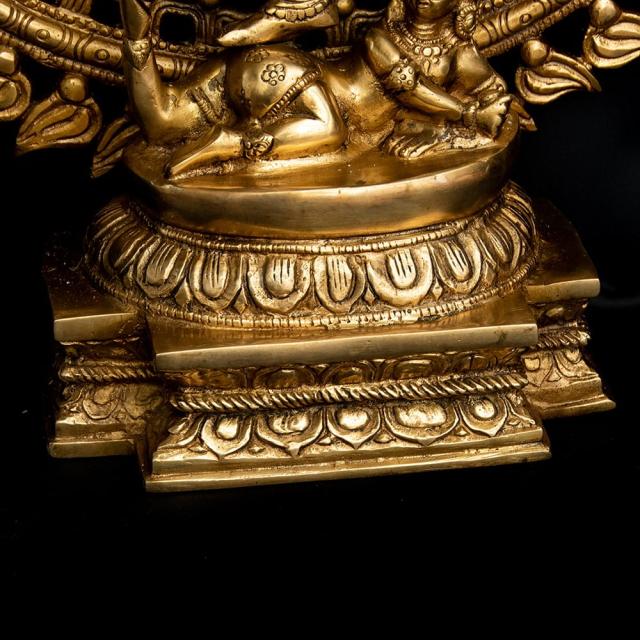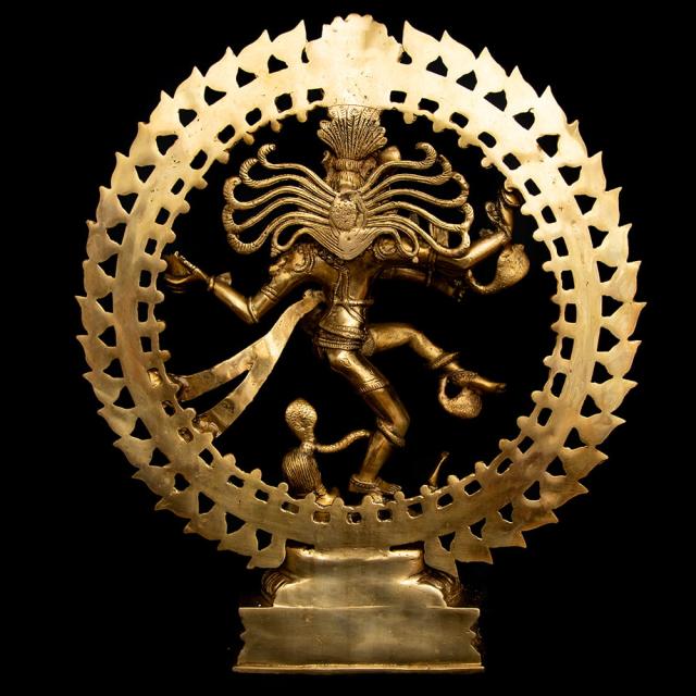 片足を大きく振り上げてガナ(小人・邪鬼)の上で踊るシヴァ神は、「舞踊王」を意味する「ナタラージャ」とも呼ばれ、非常に人気のある図像です。この図像は南インド発祥と言われており、南インドの古典舞踊にも同様のポーズや動きが盛んに使われています。火炎で縁取られた円形の光背いっぱいに広がる髪、しっかりとした体幹からしなやかに手足が伸ばされる表現からは、生命の律動がそのまま伝わってくるようです。素材は古来より仏像製作に使われてきたブラス製で、耐久性抜群。10年でも20年でもお使い頂け、年月と共に風合いがよくなります。見て、飾ってきっとご満足いただけると思います。
