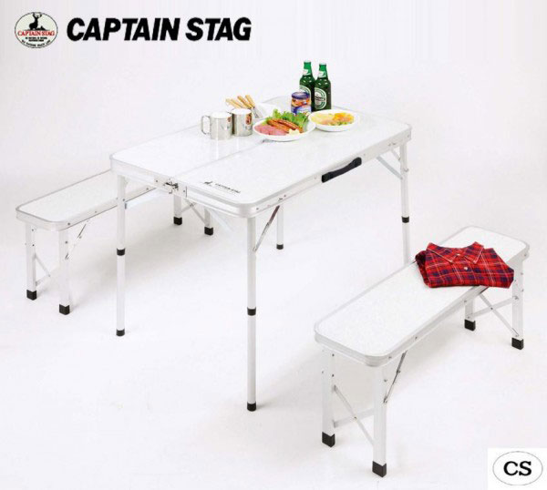 ベンチとテーブルがオールインワン収納!【サイズ】(約)組立サイズ/テーブル:幅900×奥行620×高さ700・380mm、ベンチ:幅860×奥行240×座面高さ380mm、収納サイズ:(約)幅900×奥行100×高さ320mm個装サイズ:93×11×35cm【重量】(約)8500g個装重量:9400g【素材・材質】テーブル甲板・ベンチ張り材:合成樹脂化粧箱合板、構造部材:アルミニウム(表面加工アルマイト)【仕様】耐荷重:(約)テーブル/30kg(均等)、ベンチ/140kg(片側70kg)組立式【付属品】説明書【製造国】中国 CAPTAIN STAG キャプテンスタッグ ラフォーレ ベンチインテーブルセット UC-0005 キャンプ アウトドア 屋外 野外 おしゃれ バーベキュー レジャー ピクニック 海 山 パール金属