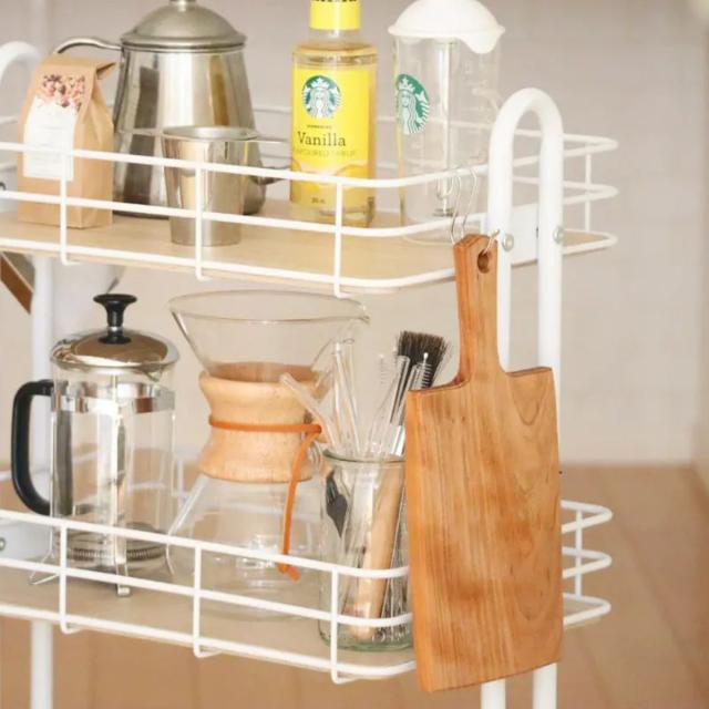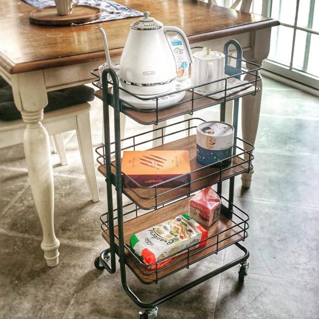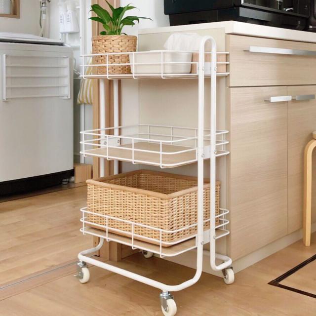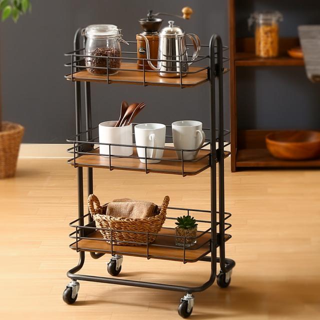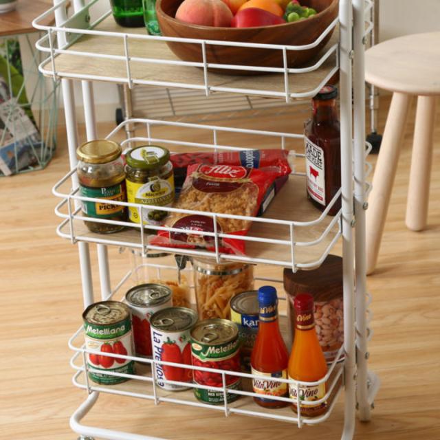 スチールフレームと木製の底板の組み合わせがおしゃれなキッチンワゴンです。食品ストックはもちろん、キッチン小物や調味料などをすっきりとまとめられます。