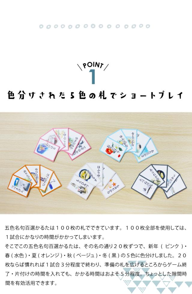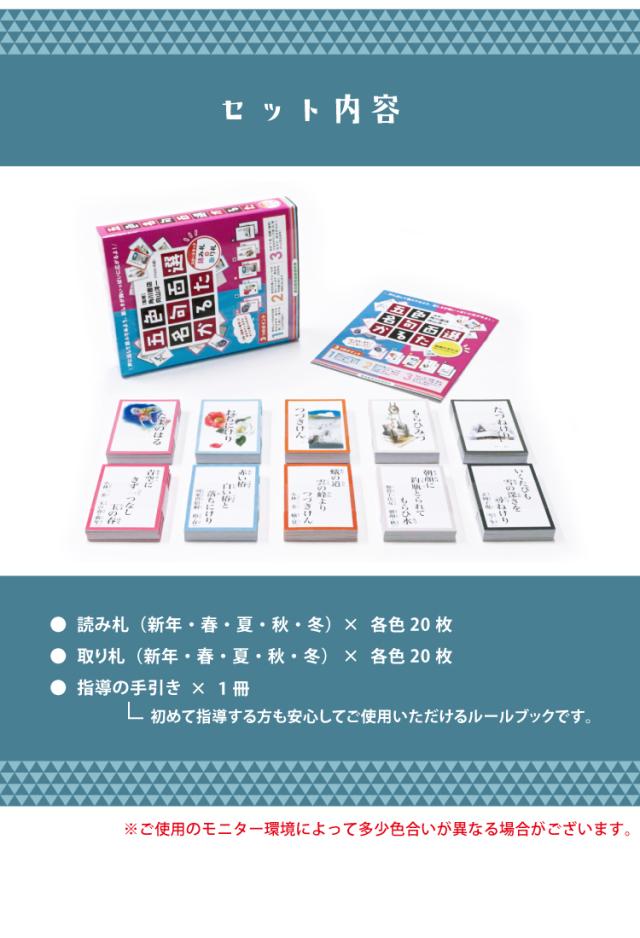 セット内容:指導の手引き×1/読み札(新年・春・夏・秋・冬)×各色20枚/取り札(新年・春・夏・秋・冬)×各色20枚