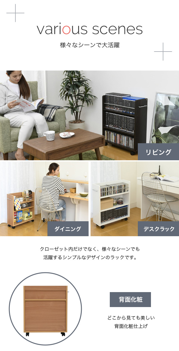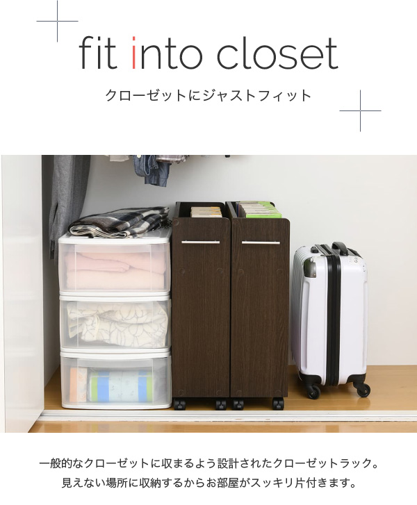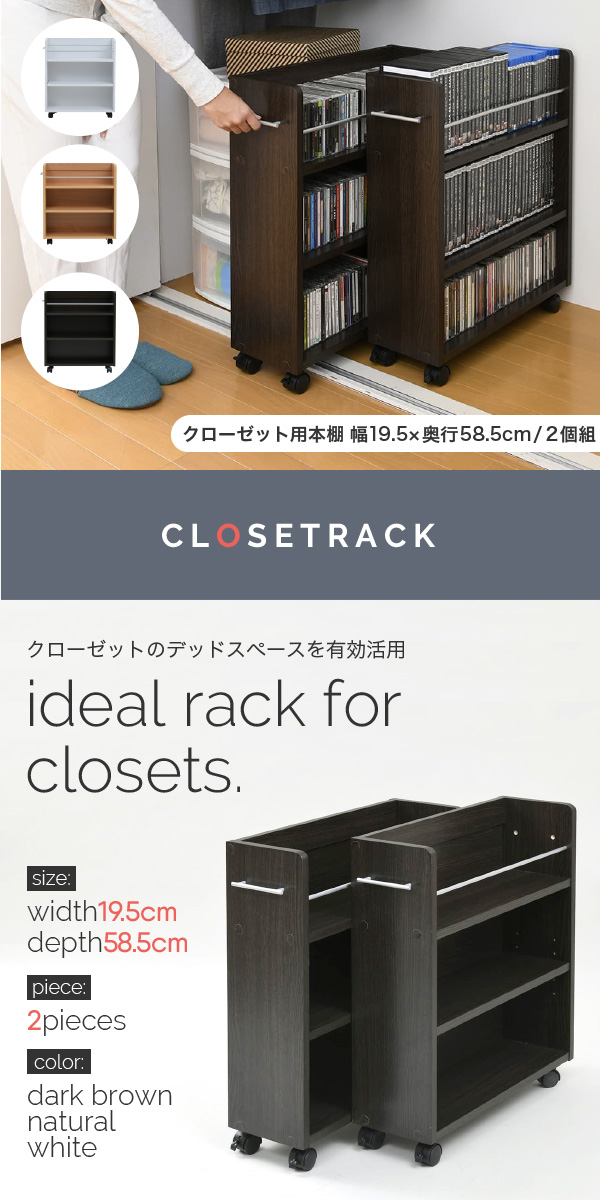CLOSET RACK クローゼット用 本棚 2個セット 幅19cmx奥行58cm (本棚 セット クローゼット用 キャスター付き 取っ手付き 大容量 収納 本 コミック CD DVD ブルーレイ 落下防止 整理整頓 ダークブラウン ナチュラル ホワイト おしゃれ おすすめ)