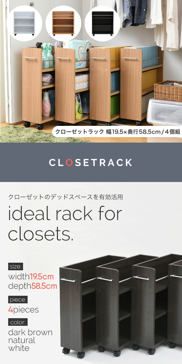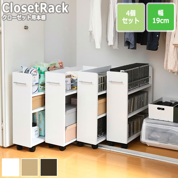 CLOSET RACK クローゼット用 本棚 4個セット 幅19cmx奥行58cm (本棚 セット クローゼット用 キャスター付き 取っ手付き 大容量 収納 本 コミック CD DVD ブルーレイ 落下防止 整理整頓 ダークブラウン ナチュラル ホワイト おしゃれ おすすめ)