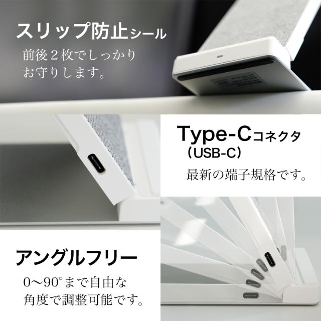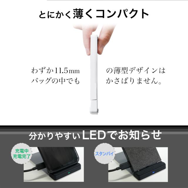 Qi対応機器またはQi対応カバーを装着した機種を置くだけで、角度を自由に調節しながら充電することができる卓上スタンド型ワイヤレス充電器です。