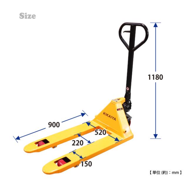 | サイズ | ・全長 1270mm ・フォーク長さ 900mm ・フォーク全幅 520mm ・フォーク爪幅 150mm ・フォーク間 220mm ・フォーク最高/最低高さ=190/75mm |