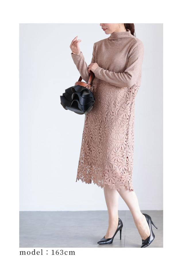 冬新作 花レース切り替えのハイネックワンピース レディース ファッション ワンピース ブラック レッド キャメル ベージュ 長袖 春 秋 冬 ニット 花 レース エレガント低身長 30代 40代 50代 60代 サワアラモード sawaalamode otona 大人 cawaii 可愛い 洋服 aljp309