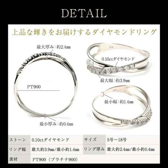 【天然ダイヤモンド×プラチナ/18金素材】上質なプラチナ/18金ダイヤモンドリング。洗練されたダイヤモンドを使用したシンプルデザインのリングは、結婚記念日はもちろん、人生の特別な節目の贈り物、女性へのギフトとしてもおすすめです。【素材・商品サイズ】ストーン:ダイヤモンド0.10ct 最大幅:約3.9mm 最小幅:約1.4mm 最大厚み:約2.4mm 最小厚み:約0.4mm リングサイズ:5号~18号 金性:プラチナ PT900【付属品】ギフトケース、ギャランティカード、お礼状、紙袋。そのままプレゼントとしてお渡し出来るので、彼女や妻、お母様など、大切な方への贈り物としてもおすすめです。手元を女性らしく華やかに演出をしてくれるダイヤリングは結婚指輪や婚約指輪にも最適です。長年ダイヤモンドの海外買付や卸売を手掛けてきた【ジュエリースタジオ プラスターならではのお得なプライスで】結婚のお祝いや記念日に。また母の日・誕生日プレゼント・クリスマス、ご自身へのプレミアムなご褒美ジュエリーにも人気の商品です。
