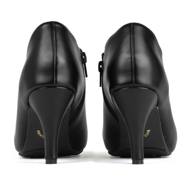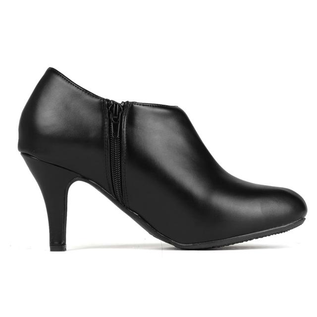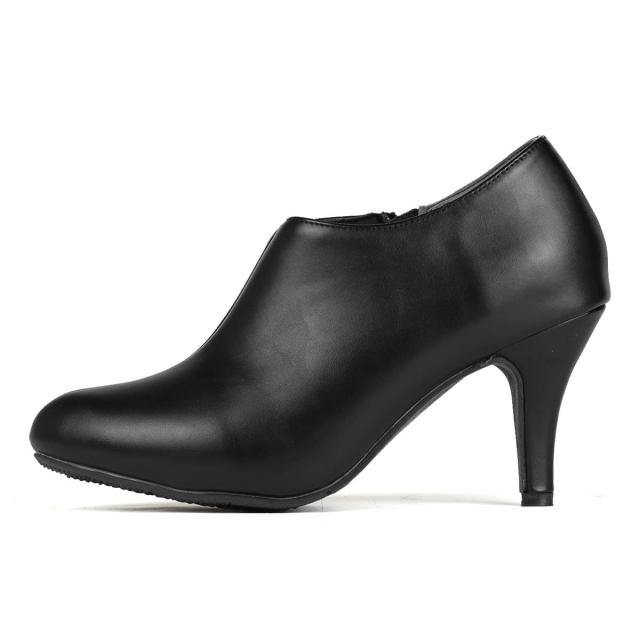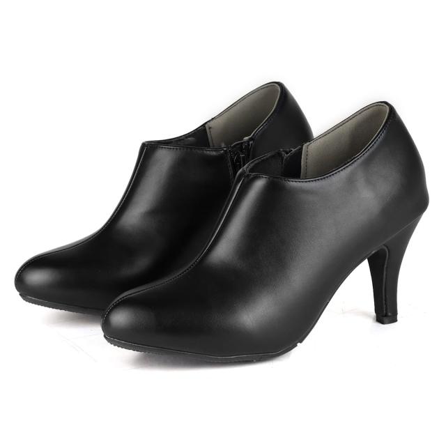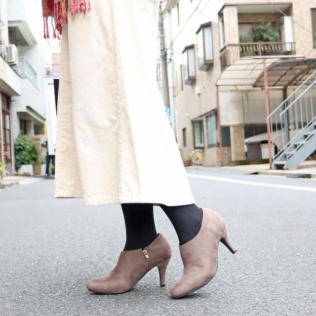 アンクル丈と8cmのピンヒールで足元をスッキリ魅せるショートブーティーなので、履くだけで足長美脚効果のある上品な一足です。