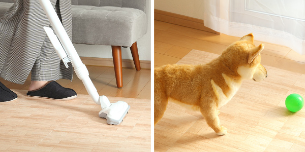 | 掃除機で吸い上がらない 床にピタッと吸着しているので掃除機をかける際も吸い上がらず、スムーズにお掃除が行えます。 | 毛羽立ちが少なく引っ掛りにくい 表面の毛羽立ちの少ない素材を使用しているのでペットの毛が引っ掛りにくく、ワンちゃんがつまずきにいです。 |
