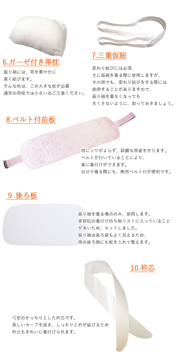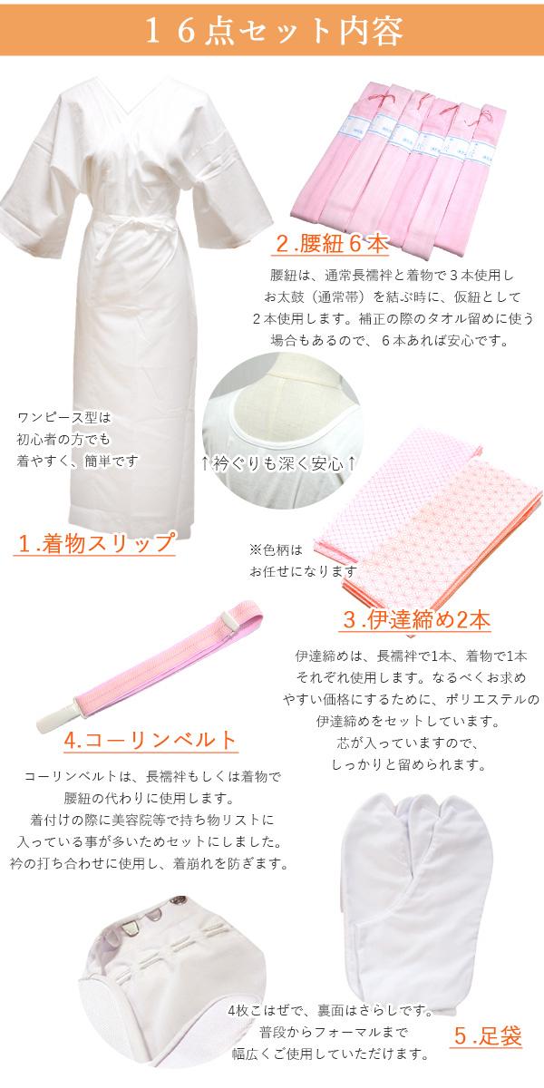 着付け小物 セット 振袖 16点 女性 レディース 初心者 振り袖 成人式 着物スリップ 腰ひも 伊達締め コーリンベルト 足袋 蛤型 帯枕 三重 仮紐 帯板 後板 衿芯 【 着付 小物 セット 女性 レディース