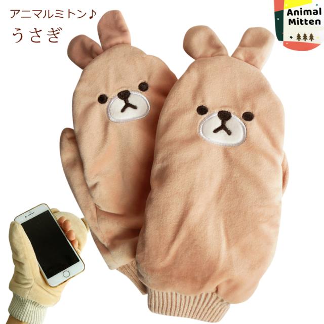 送料無料 手袋 ミトン てぶくろ うさぎ ウサギ ピンク ぬいぐるみ 裏ボア アニマル ふわふわ パペット かわいい 耳つき スマホ クリスマス プレゼント ギフト レディース モコモコ 指切り 指が出せる 通勤 通学 防寒