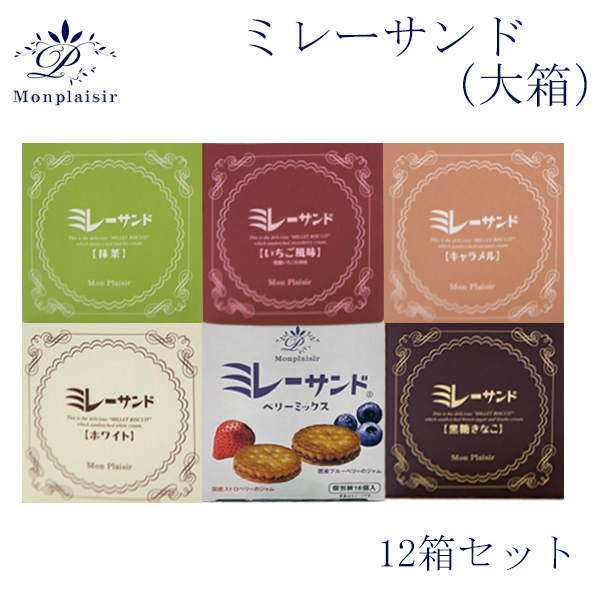 ミレーサンド (大箱) 12箱セット モンプレジール いちご風味 ホワイト キャラメル 抹茶 黒糖きなこ ストロベリー 苺 高知 ご当地 ミレービスケット まじめなおかし チョコ