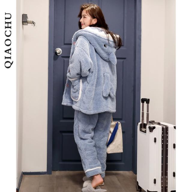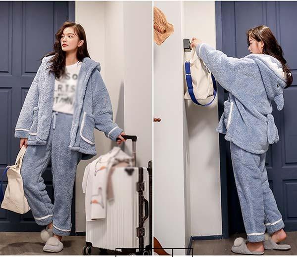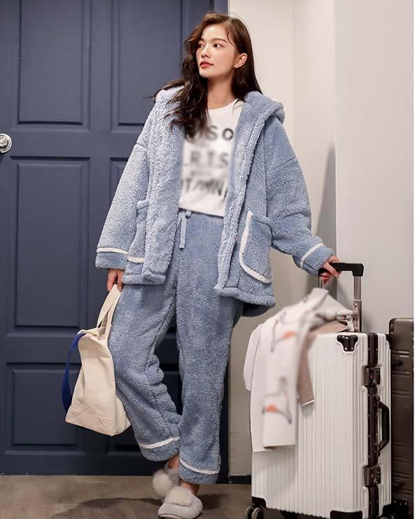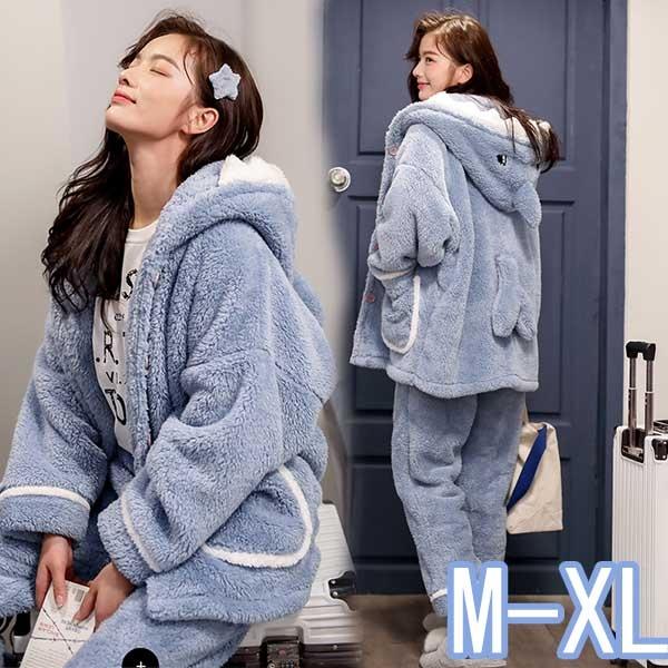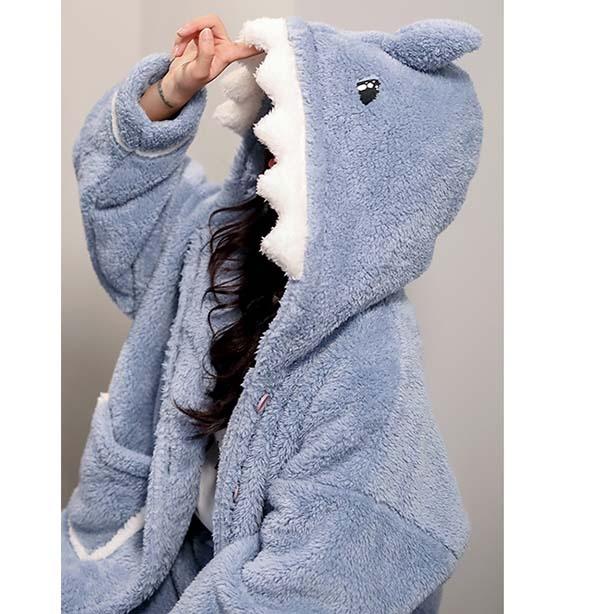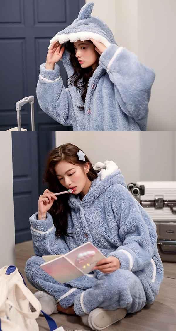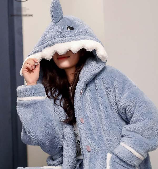【送料無料】ルームウェア 寝巻き 寝間着 サメ柄 かわいい 萌え 暖かい ズボン付き 小柄 パジャマ 着心地よい レディース ゆったり 気持ちいい 癒し感 長袖パジャマ お揃い 前開き サンゴベルベット 冬 女の子 おしゃれ